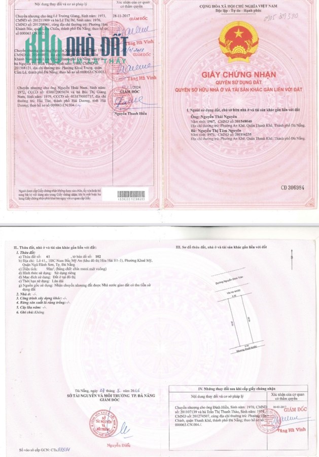 Bán 2 lô liền kề , Đất đường Nguyễn Đình Trân, Phường Khuê Mỹ, Ngũ Hành Sơn, Đà Nẵng .Đường dài và thông ra Biển.Đường rộng 7,5m,lề 4,5m.Diện tích 10x18=180m²,Hướng: Bắc.Gi á: 16tỷ có thương lượng.Với địa thế tốt gần Biển Sơn Thủy,Bệnh Viện 600 giường, dự án SaPhia.Rất tiện cho việc xây dựng Biệt Thự, nhà hàng,khách sạn.v,v..Sổ đỏ không vay Ngân Hàng hay cầm cố.Đầy đủ pháp lý,luôn tạo niền tin và an tâm cho người mua. Khách có nhu cầu liên hệ Anh Minh, Công Ty Bất Động Sản Hai Minh Long,Lô 86 Đường Nguyễn Khắc Viện, Phường Ngũ Hành Sơn,Đà Nẵng. Chúng Tôi luôn đồng hành cùng khách hàng trong các khâu tư vấn giá mua bán,địa thế sản phẩm và tiềm năng sinh lời, Nhận Bán giúp Nhà, Đất cho những khách hàng ở xa, Hỗ trợ vay 3 bên, Vay Ngân Hàng lãi suất tốt..Đảm bảo vay trên 70% giá trị tài sản cần thế chấp.Nhận đo đạc, tách thửa, nhập thửa, lên đất ở, đất cây lâu năm,gia hạn đất màu, đất trồng cây lâu năm, nhận thiết kế nhà,xin giấy phép xây dựng. Lh:0934.808.768
