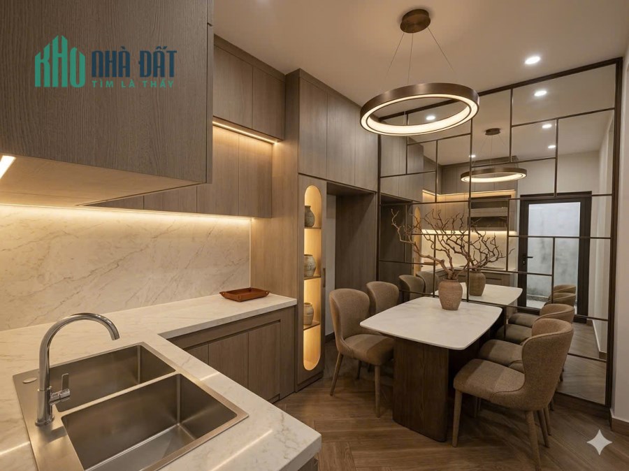 - Liền kề là nhà bếp thiết kế chữ L tối ưu diện tích, hệ tủ bếp trên- dưới.